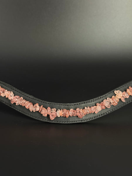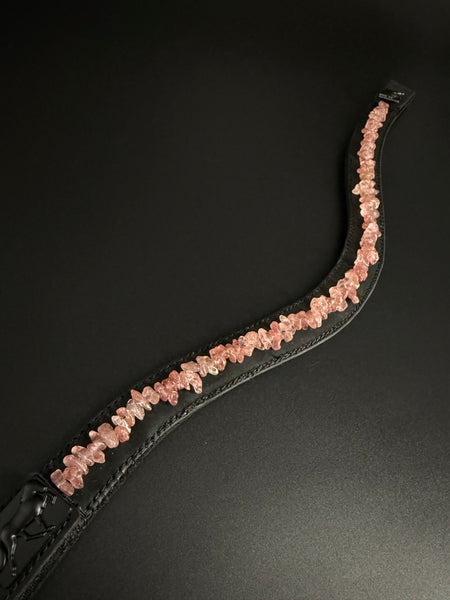 Die Steine werden auf dem schwarzen weichen Lederriemen in liebevoller Handarbeit aufgenäht.